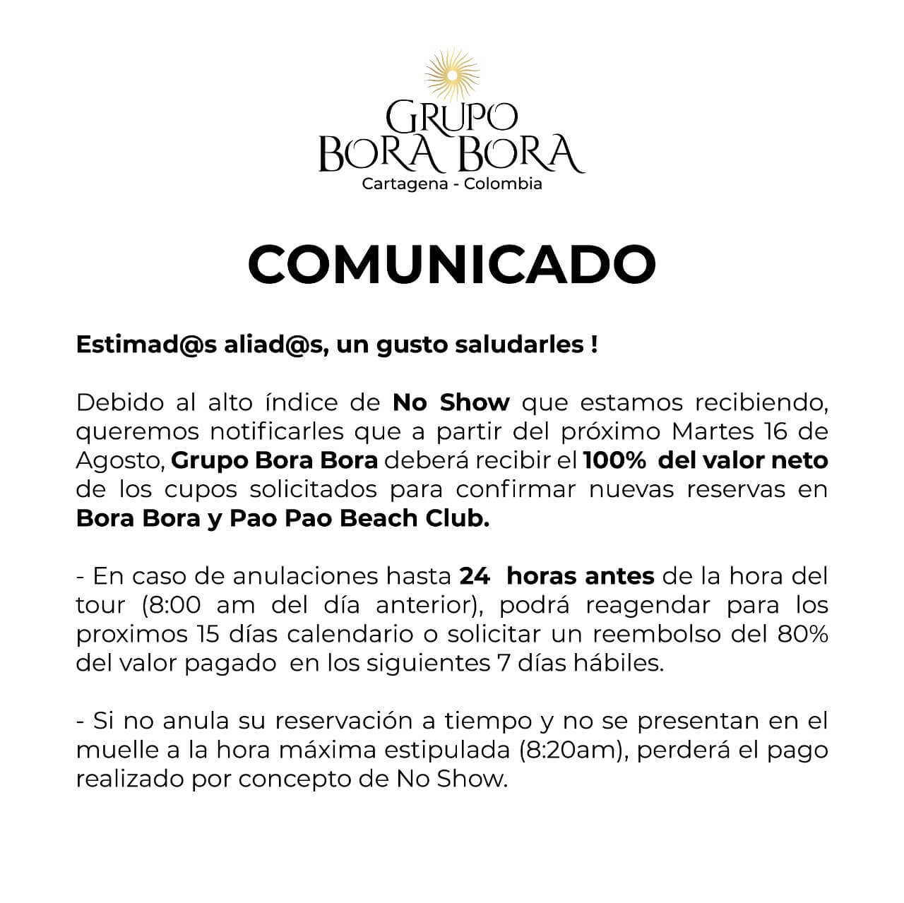 El acceso a este exclusivo paraíso se realiza desde el Muelle de La Bodeguita, en Cartagena. Los pasajeros deben presentarse en la Puerta No. 3 entre las 7:20 y 8:20 a.m., donde serán recibidos por el equipo de Bora Bora para abordar las lanchas rápidas que los llevarán directamente al club.